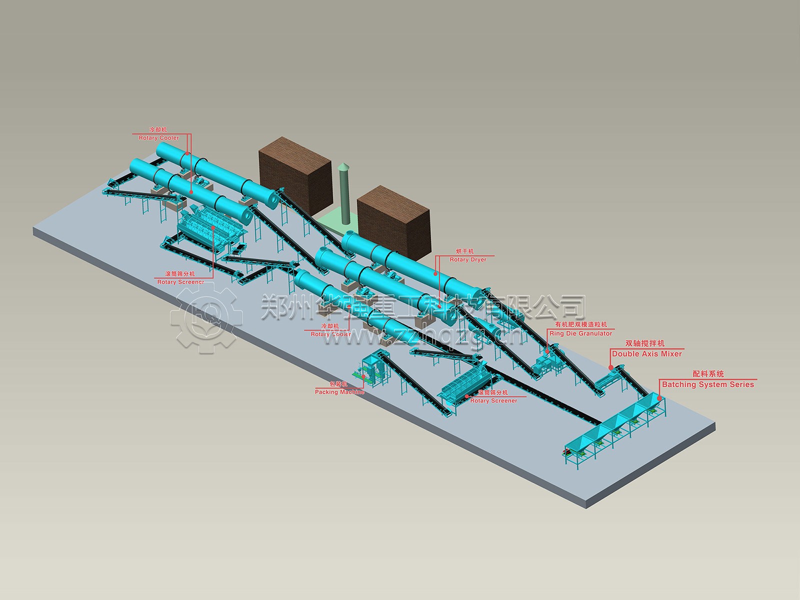 鄭州華強重工科技有限公司 ,自主開發和生產出適合有機肥和生物有機肥生產使用的發酵設備、烘干設備、造粒設備、分篩系統、配料系統等全套肥料設備。我公司具有雄厚的技術力量、高素質的員工隊 伍和CAD 設計中心,能夠為肥料企業提供廠房設計、工藝改進、設備制作、安裝、調試,配方等一系列的全方位服務,產品覆蓋全國各地,部分產品已配套出口。公司主營產品:地面行走式翻堆機、槽式翻堆機、粉碎機、攪拌機、造粒機、烘干機、冷卻機、篩分機、包裝機、除塵脫硫設備等,可根據客戶的要求設計1萬-50萬噸的有機肥生產流水線及車間廠房設計、提供成套有機肥設備、BB肥成套設備、有機無機肥設備、高中低塔肥設備、轉鼓蒸汽復混(合)肥設備、脲甲醛肥設備、氨酸肥設備、氨化肥設備、全融溶噴漿肥設備、尿基噴漿肥設備、擠壓肥設備及雞糞等高濕物料烘干發酵設備。